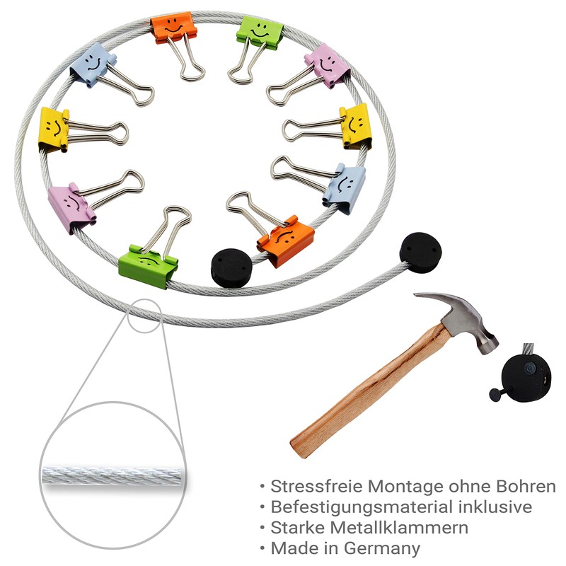LeTOMA - High-quality steel photo rope with rustic wooden clips 45 mm - photo rope with elegant non-slip coating