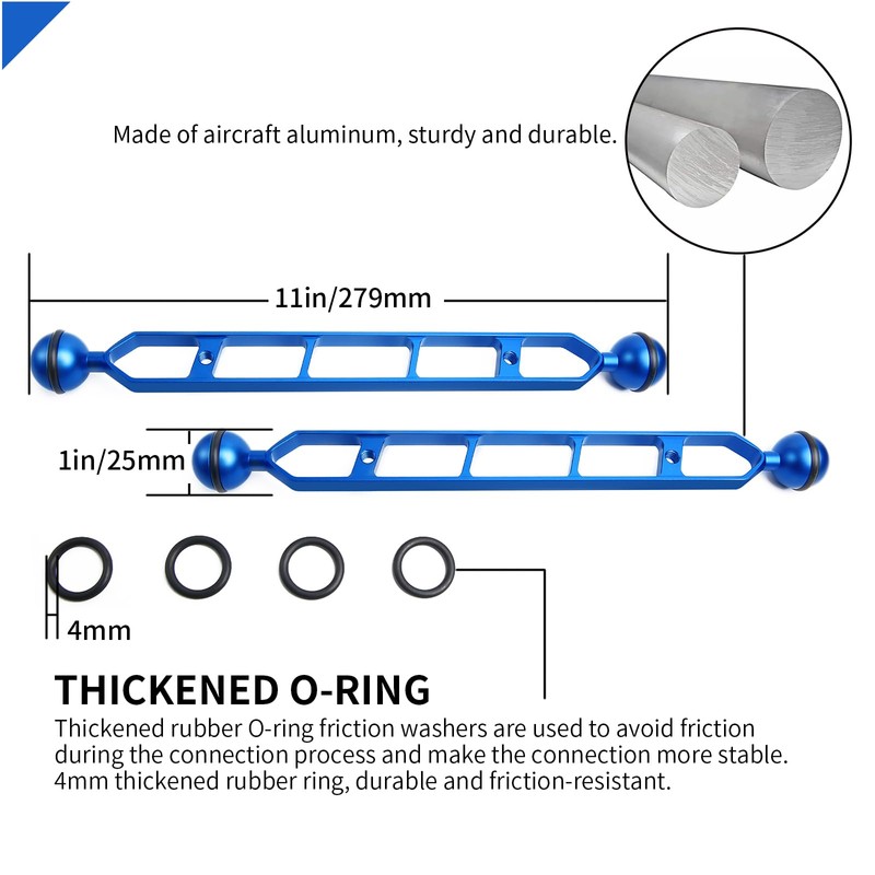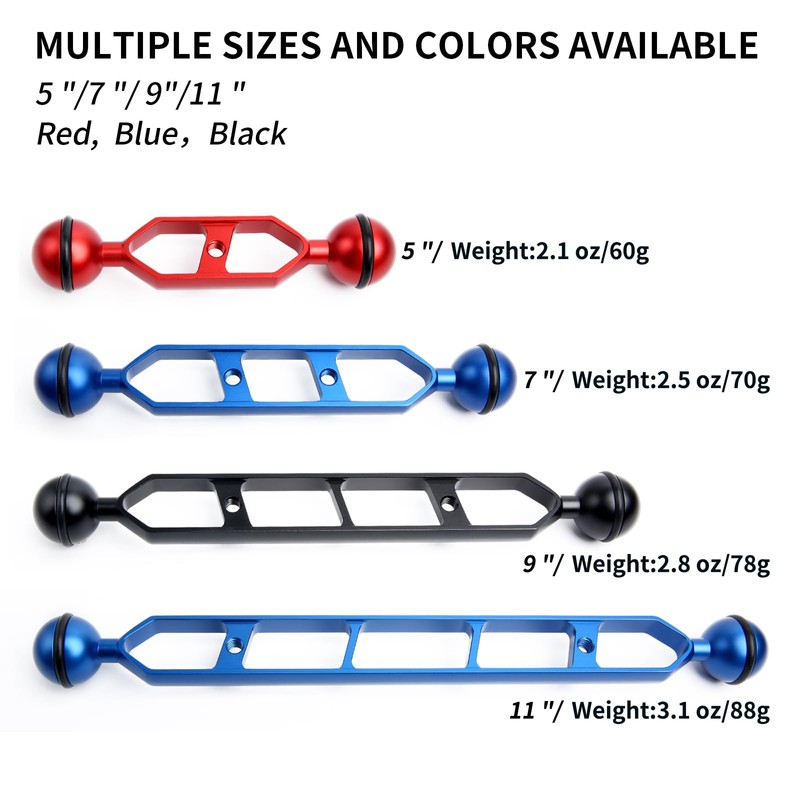 • 【Compatibility】Length: 11''/27.94cm; Sphere size: 1"/25mm; Weight: 3.21oz/91g. Compatible for all arm systems that has a ball head which diameter is 25mm/1 inch.Multiple dive rigs (e.g. fill light, buoyancy arm, etc.) can be attached by extending the dive light arm