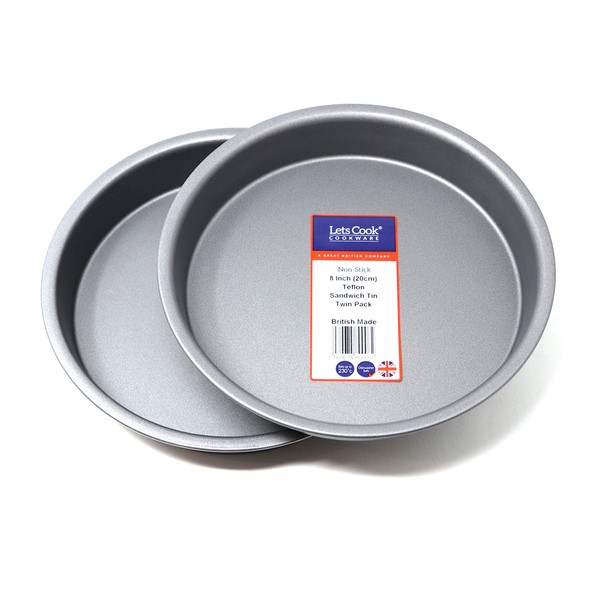 - 8 Inch Victoria Sandwich Tin Twin Pack, Fixed Base, 20cm, British Made with Teflon Non Stick by Lets Cook Cookware