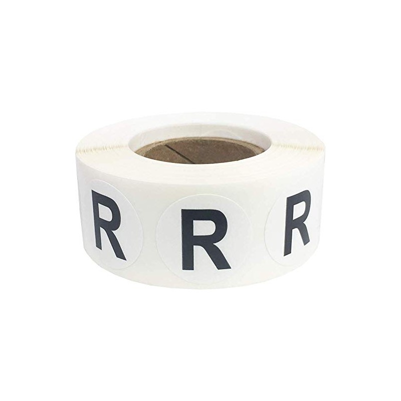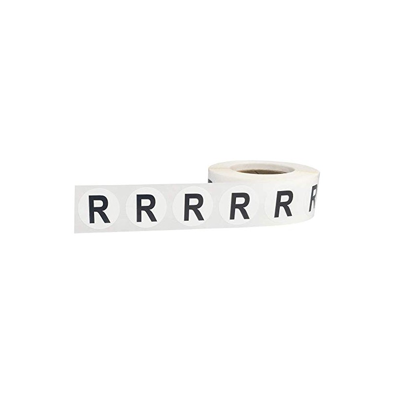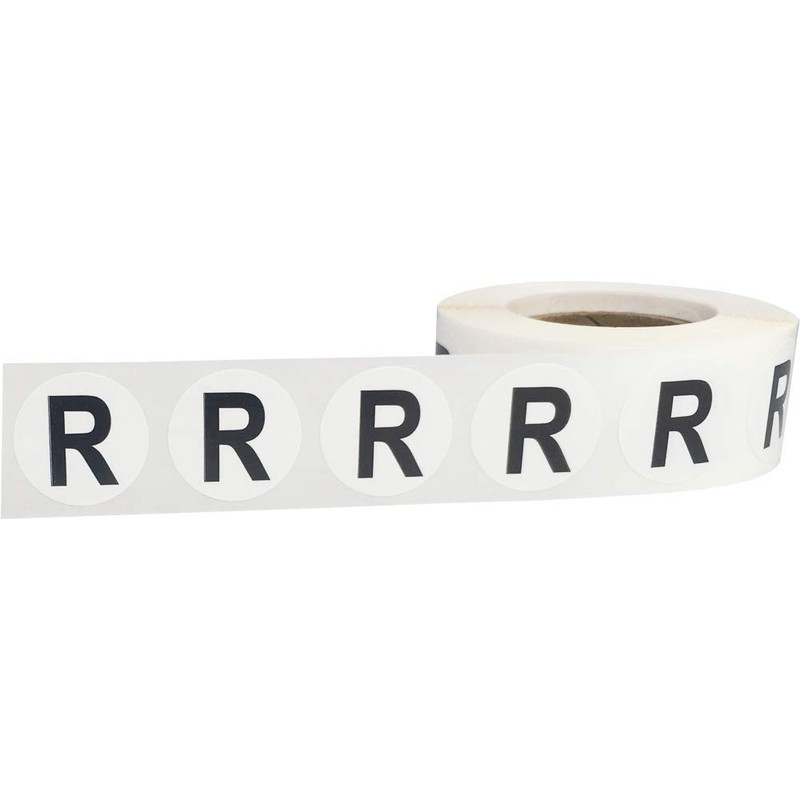 Alphabet letter R stickers for inventory, classroom, offices and more. There are 500 letter R stickers on each roll, which are easy to peel and apply by hand. These are small 3/4" inch round in size, which are the exact size of a penny. Since these are small, they are able to be re-adjusted and removed as needed. This is even though they are made with an industry standard permanent adhesive.