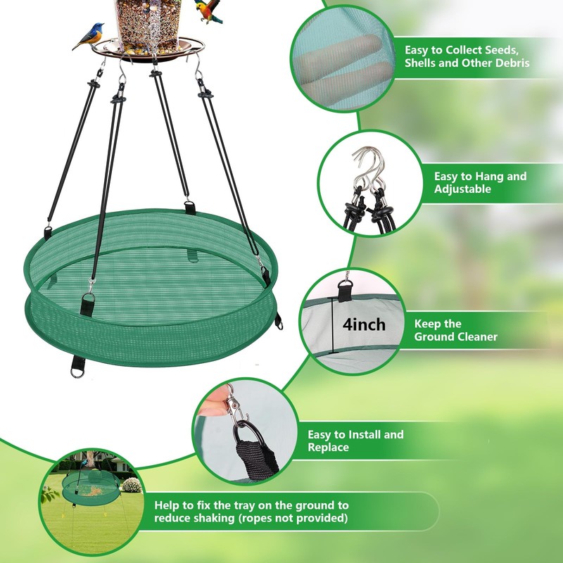 - Easy to Install and Use: the bird seed catcher tray is equipped with a hook and mounting ring, which can be easily hung under the bird feeder; In addition, if you are worried that the tray will shake, you can fix it to the ground with a rope through the below installation rings, or hang a heavy object below to make it more stable