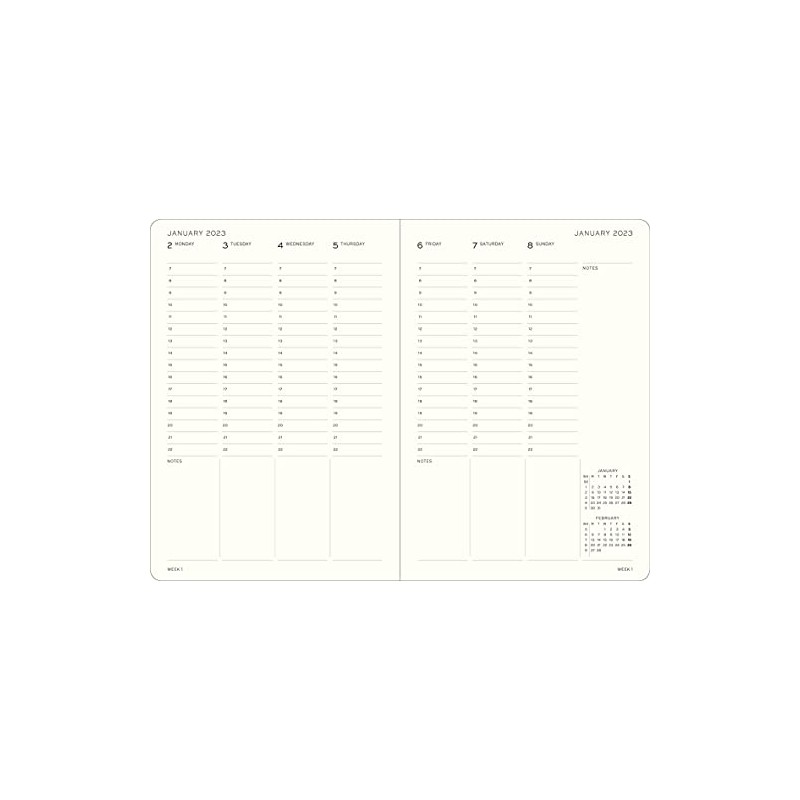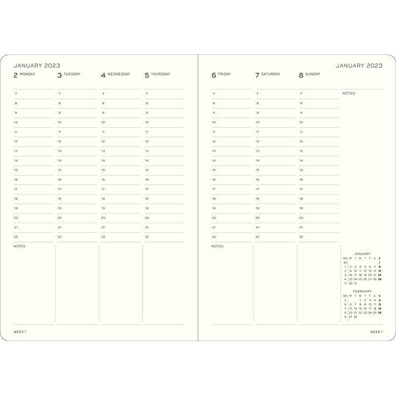• The unique layout of this planner is that each week extends across a double-page spread, with each day divided into time slots. That means you can mark in all of your appointments at their precise times.