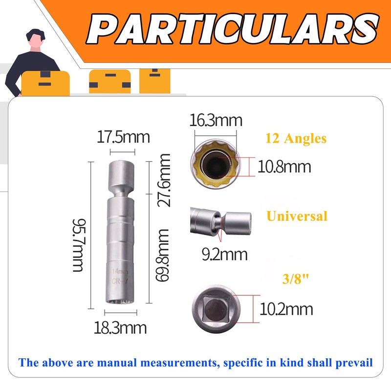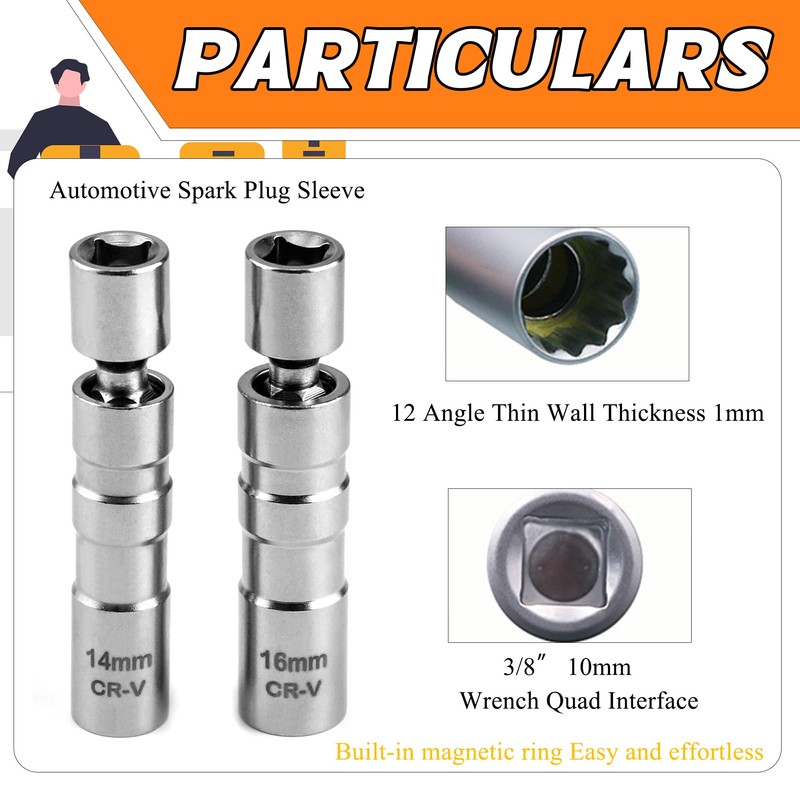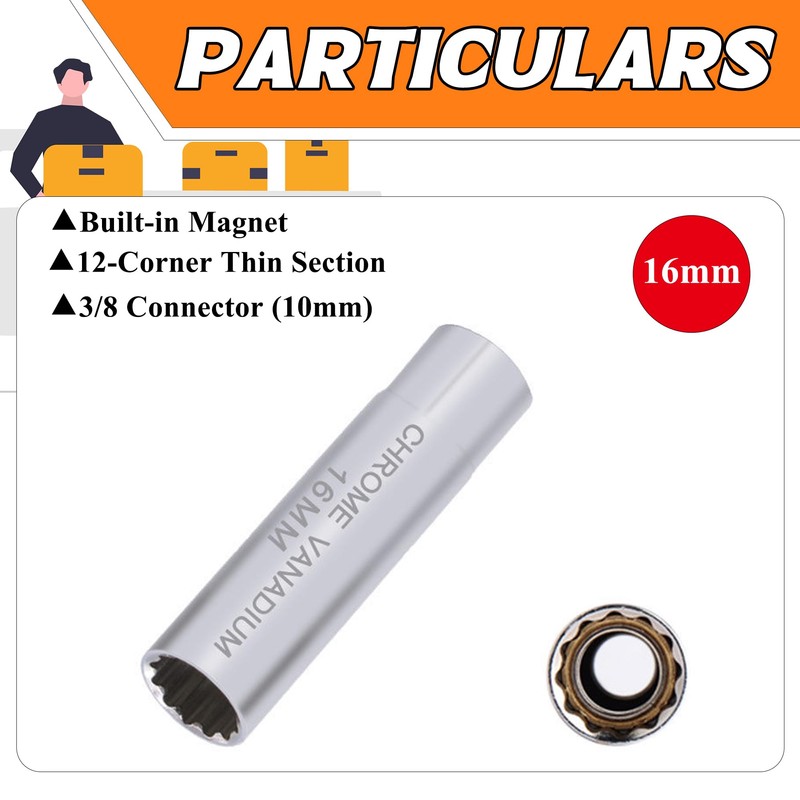 - Specifications: This innovative thin-wall drive magnetic wall spark plug socket incorporates a precision-engineered 12-point design that ensures a secure and reliable grip on the spark plug. It features dual-sized heads, measuring 16mm and 14mm, making it versatile and compatible with a variety of spark plug sizes. Additionally, it comes with a 3/8-inch wrench attachment, which allows for easy and efficient removal and installation of spark plugs. The socket's magnetic wall design also ensures that it stays securely attached to metal surfaces, preventing it from being misplaced or lost during use.