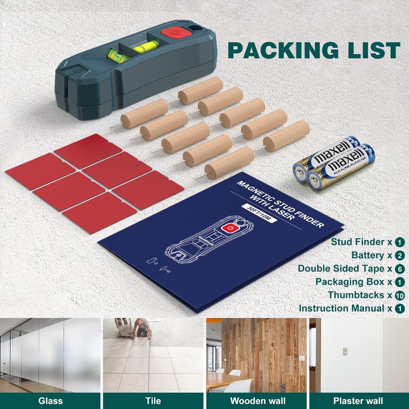 - [PACKAGE CONTENTS]: Along with the stud finder, you'll receive 10 thumbtacks, 2 AAA batteries, 6 double-sided tape and a manual. If you have any questions or concerns, our customer service team is here to help.