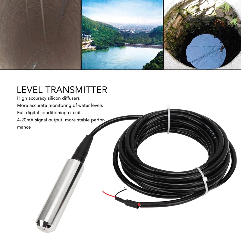 1、ACCURATE SENSING: Input level transmitters and high accuracy silicon diffusers bring more accurate monitoring of water levels 2、STABLE SIGNAL: Level transmitter adopts full digital conditioning circuit, 4‑20mA signal output, to ensure more stable performance 3、DURABLE AND NON CLOGGING: Liquid level transmitter adopt corrosion resistant material, excellent corrosion resistant performance, excellent solid structure, prevent bending, with high accuracy, high stability, prevent clogging hole design, easy to clean 4、WITH CABLE: The housing of the water level sensor probe is made of 304 stainless steel with waterproof cable for healthy use and suitable for water level detection 5、SAFE AND WATERPROOF: The liquid level sensor probe has IP68 multi layer waterproof protection, safe to use with long service life 6、ADJUSTABLE PROTECTION: Level transmitter has reverse polarity and current limiting protection, laser temperature compensation, programmable adjustment