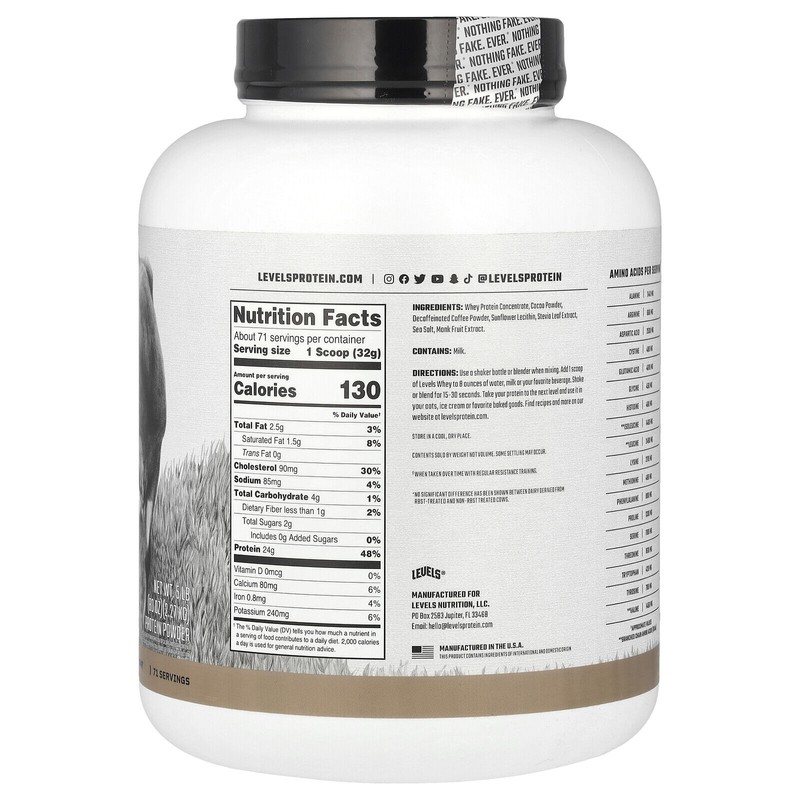 24 g Protein 5.4 g BCAAS Helps Build Lean Muscle And Supports Post-Workout Recovery‡ No Hormones^ No Added Sugar* No Gluten No Soy Quality milk tastes better, way better. That's why grass-fed and hormone-free dairy^ is the only dairy we use to make our whey protein concentrate. Whey concentrate is the least processed form of whey, which means it's loaded with high-quality complete protein and essential amino acids. Each batch of Levels® Whey is cold-process microfiltered and blended with sunflower lecithin for that insanely easy mixing you expect. You'll find no deception here, either. Our blend is delicious. That means no added sugar", no artificial sweeteners, and no bogus fillers. Levels® was built because we recognized supplements hadn't changed, but everything around them had. What existed was a hellscape of products loaded with artificial sweeteners, imitation flavors, and bogus fillers. We ditched the played out model that was used for years and reimagined supplements with purposeful nutrition and minimal ingredients. Trusted by athletes, fitness enthusiasts and daily grinders everywhere, our products are crafted for everyone's lifestyle. Nothing Fake. Ever.™ We never use any artificial sweeteners or bogus fillers. GMP Certified This product is produced using Good Manufacturing Practices. ‡When taken over time with regular resistance training. ^No Significant difference has been shown between dairy derived from rbst-treated and non-rbst treated cows. *Not a low calorie food, see nutrition information for calorie and sugar content.SUGGESTED USE: