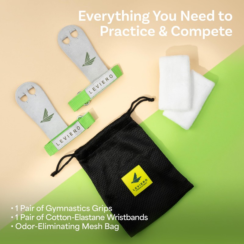 - A COMPLETE SET: At LEVIERO, we want to make sure you always have everything you need for your favorite sport - which is why our gymnastics palm grips come with handy gymnastics grips accessories! These include a pair of cotton wristbands, as well as a mesh carrying bag that will reduce odors after long training sessions.