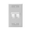 Angled single-gang wall plates accept QuickPort snap-in modules to support multimedia applications with either 1, 2, or 4 ports. Use where designation windows in an economical single-gang flush-mount housing are desired. Available in four colors: White, ivory, light almond and Black (4-port only).