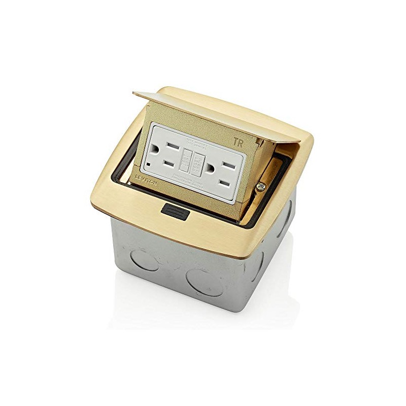 Leviton PFGF1-BR Pop-Up Floor Box with 15 Amp, Tamper-Resistant Self-Test GFCI Outlet, Brass