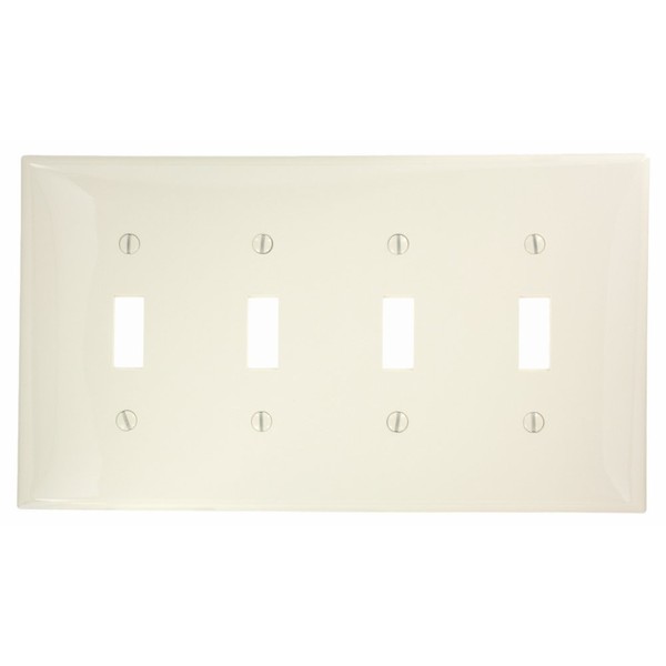 Familiar and functional, Leviton Traditional Wallplates are designed for use with Traditional Leviton devices. They represent styles and form factors that have stood the test of time. Their clean lines work in virtually any location, whether in new or retrofit construction, and they install quickly and easily. 4-Gang Toggle Device Wallplate, Midway Size, Thermoplastic Nylon, Device Mount, Light Almond.