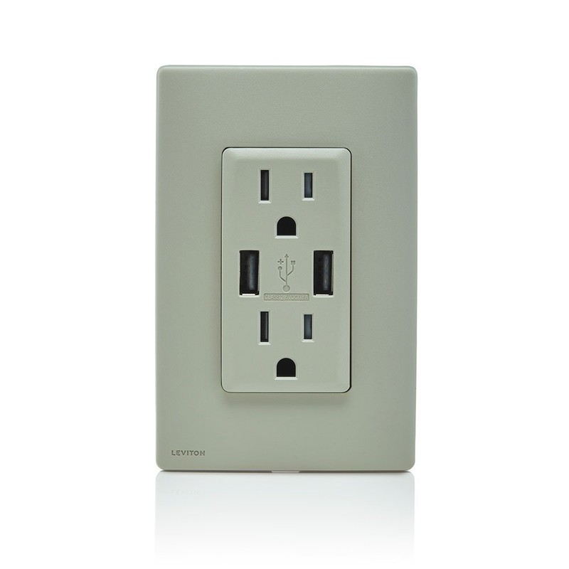 Leviton Renu USB Charger/Tamper-Resistant Duplex Outlet, 15A-125VAC, RUAA1-WS, Wood Smoke