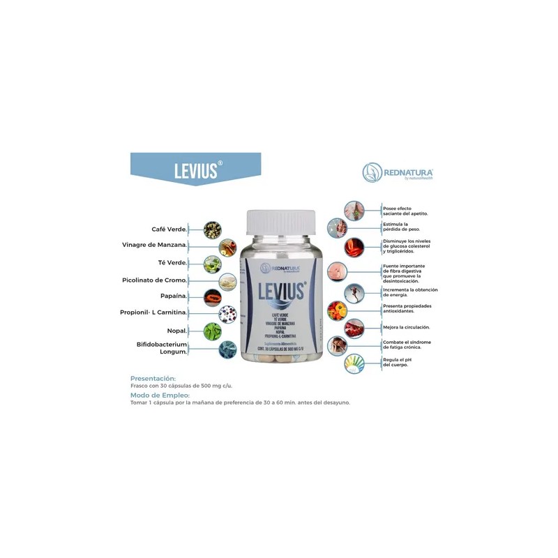 Rednatura Levius Vinagre De Manzana Y Té Verde 30caps Sfn es un suplemento nutricional diseñado para aquellos que buscan mejorar su bienestar general. Este producto combina ingredientes naturales como el café verde, vinagre de manzana y té verde, que son conocidos por sus propiedades antioxidantes y su capacidad para apoyar el metabolismo. Cada cápsula contiene una mezcla única de picolinato de cromo, papaína, propionil-L-carnitina y nopal, lo que lo convierte en una opción ideal para quienes desean complementar su dieta de manera efectiva. Además, es libre de gluten y lactosa, y es apto para veganos, lo que lo hace accesible para diferentes estilos de vida. Con un formato práctico en cápsulas y un total de 30 unidades por envase, este suplemento es perfecto para quienes buscan un impulso en su rutina diaria. Recuerda que este producto no es un medicamento y su uso es responsabilidad del consumidor.