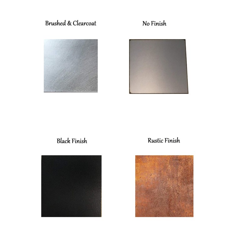 - Finishes : Brushed and Clearcoat, Rustic, Black, or No Finish (The "No Finish" option will start to rust if not painted or protected)