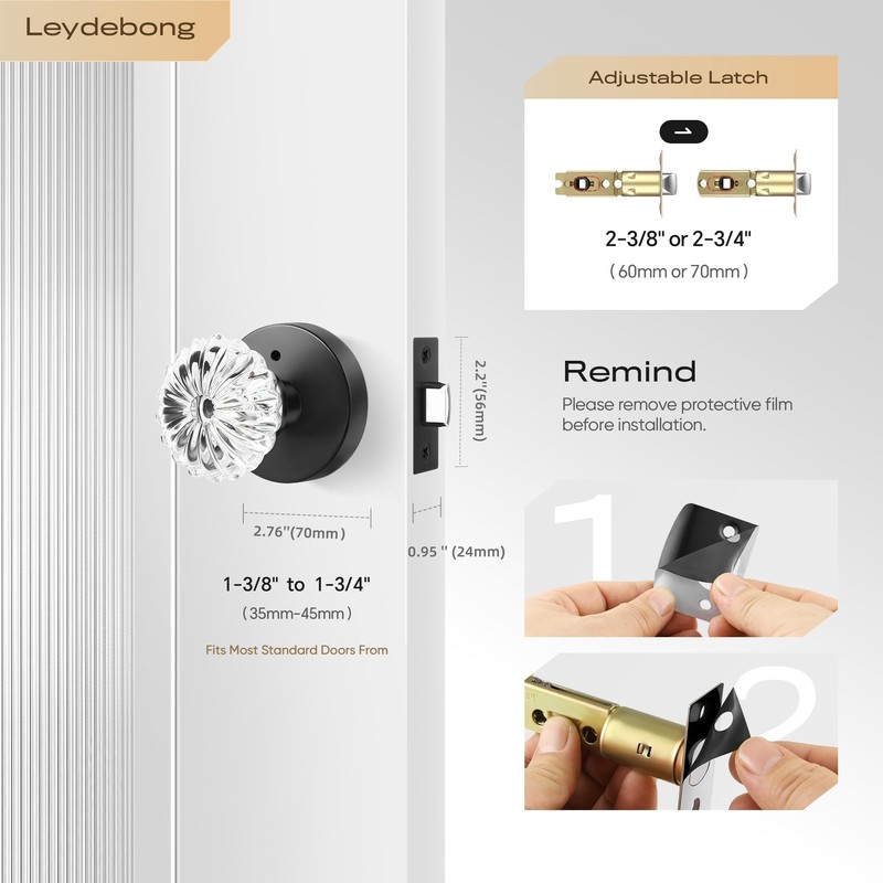 - Adjustable Latch: The latch is adjustable to 2-3/8" or 2-3/4" and fits doors 1-3/8" to 1-3/4" thick. The knob comes with all necessary accessories and installation instructions. Any problems about your purchase, please let us know, we are always here to help.