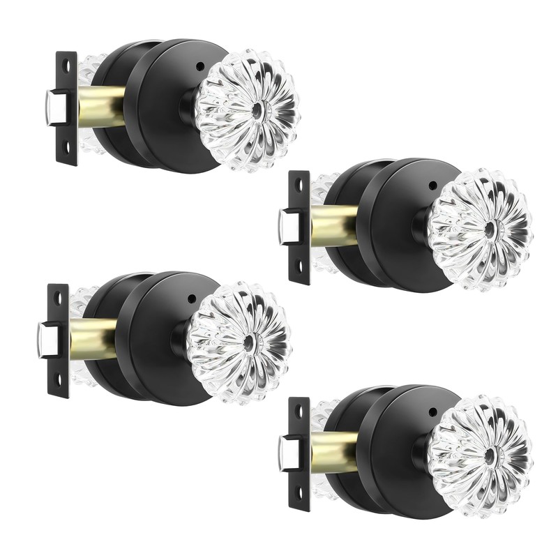Leydebong Crystal Glass Door Knobs, Interior Privacy Door Knobs with Lock for Bedroom/Bathroom, Heavy Duty Design, Matte Black Finish, 4 Pack