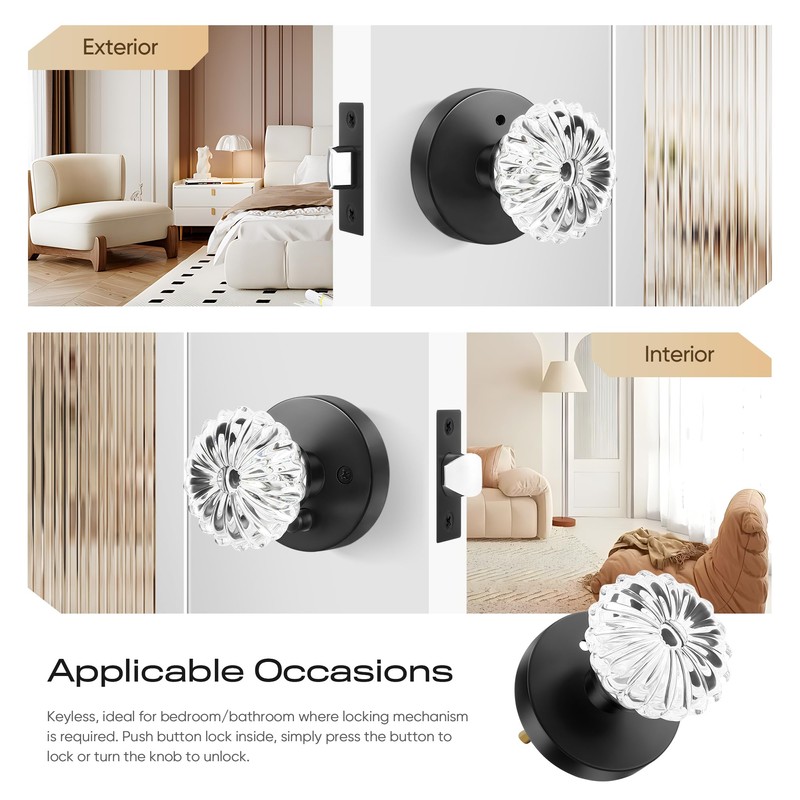 - Privacy Function(No Key): Ideal for bedrooms and bathrooms, these knobs lock/unlock with a push/pull button and include an emergency release hole that works with a hex key.