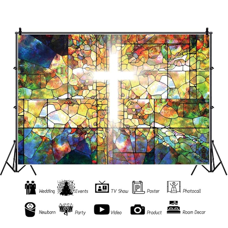 Leyiyi 8x6ft Glowing Cross Backdrop Holy Bible Cross Stained Glass Backdrop for Church Activity Decorations Banner Jesus Christian Church Sanctuary Religious Xmas Party Photo Backdrop Photo Props