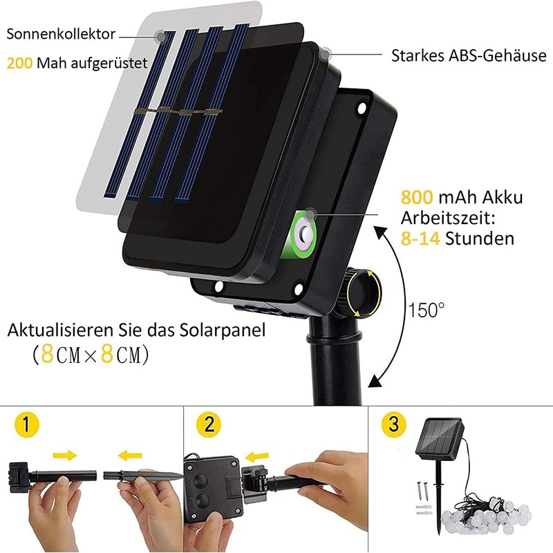 - ? Energieeffizient und umweltfreundlich: Das Aufladen mit Solarenergie ist umweltfreundlich und verursacht keine Stromkosten. Tagsber wandelt das hocheffiziente Solarmodul das Sonnenlicht in Strom um, der in die wiederaufladbare Batterie eingebaut wird, und nachts schalten sich die Lichterketten automatisch ein.