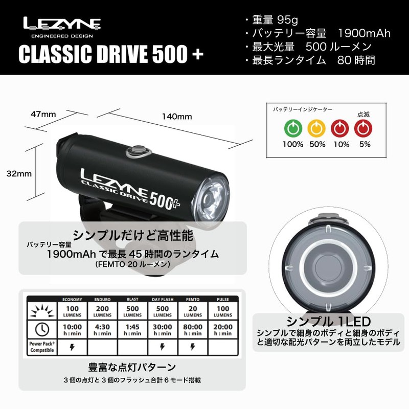 LEZYNE CLASSIC DRIVE 500+ Bicycle Kickboard, Simple and Classical Design, Front Light, Silver, Compact, Strap Fixed, Genuine Product
