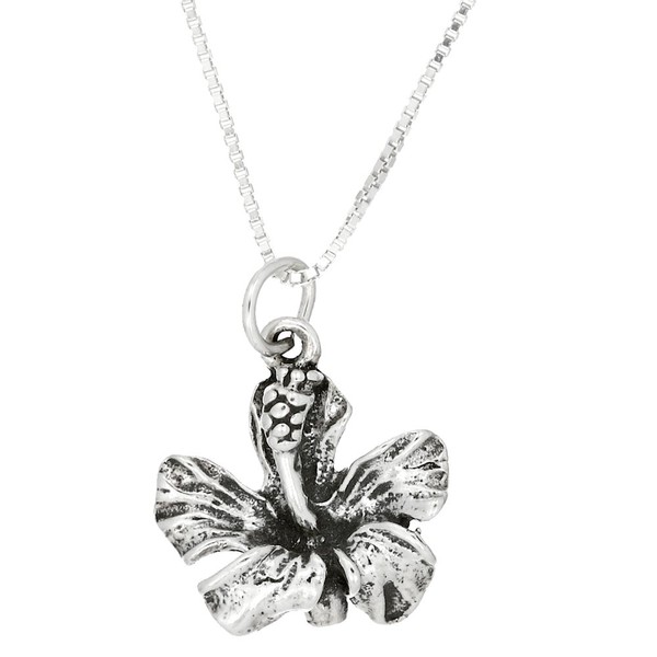 LGU Sterling Silver Oxidized One Sided Hibiscus Flower Charm Pendant and Polished Box Chain Necklace (24 Inches)