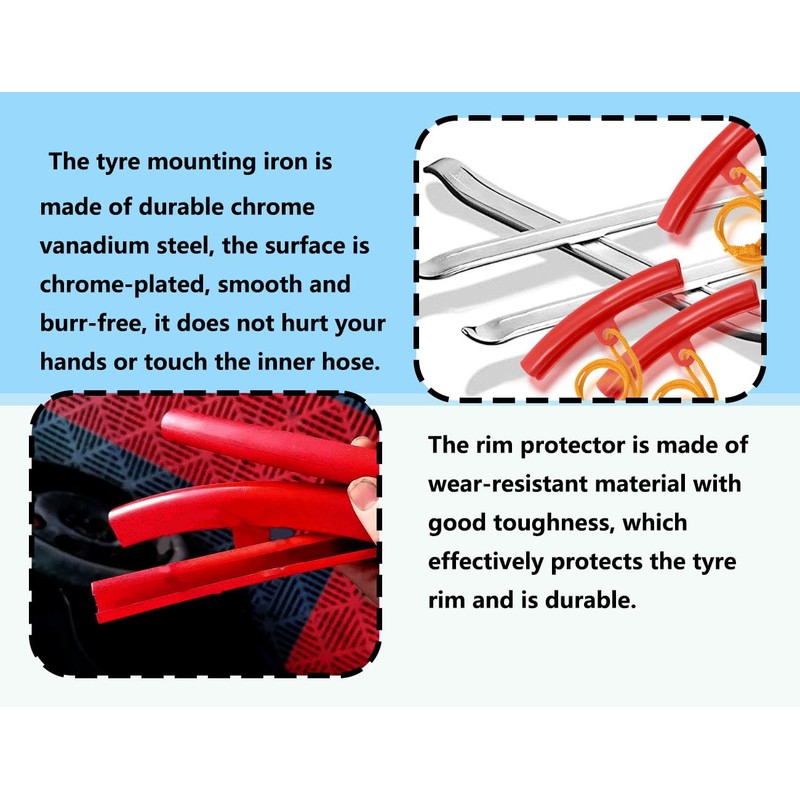 • [High Quality Material]:The tire lever is made of high quality metal material, which is sturdy and durable and can withstand higher pressure. The rim protector is made of high quality polyurethane material, which is soft and durable and does not cause damage to the rim surface.