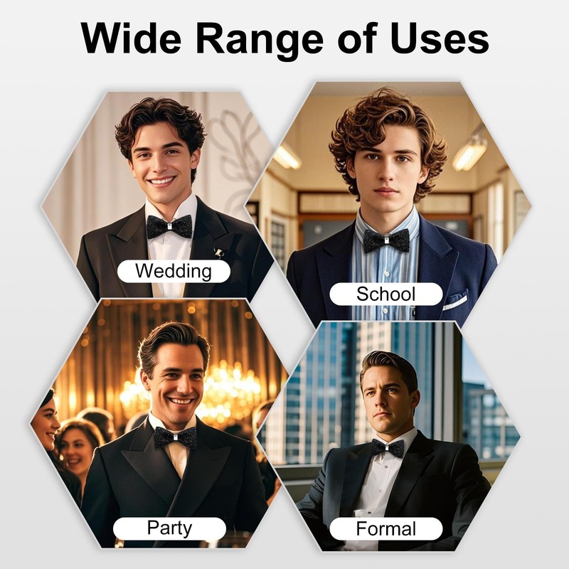 - Adjustable Sequin Bow Tie: The length of the mens bowtie neck strap can be easy to adjusted, It can flexibly adapt to the neck circumference of different men, stable and comfortable; A ideal bowtie for men to save time and effort