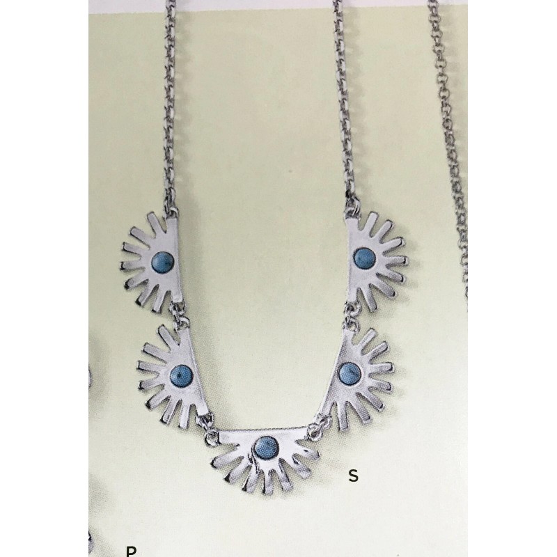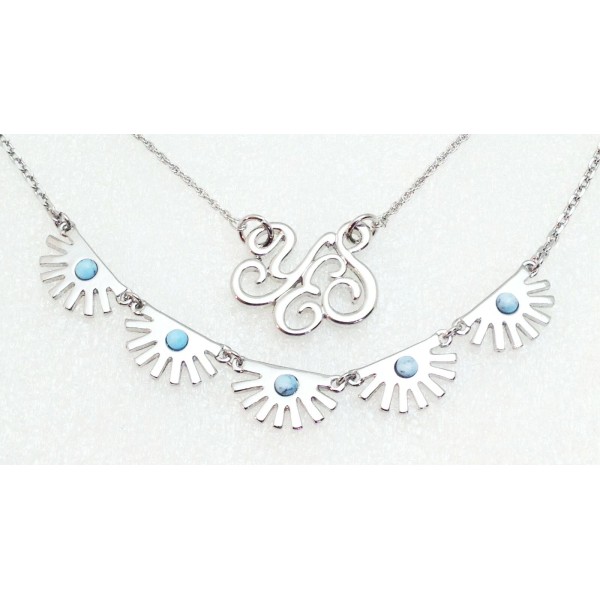 Lia Sophia lot of two necklaces, Super Fan necklace in silver tone has fan shapes and turquoise, 16-19", and Optimistic silver tone necklace has "yes" in script writing, pendant is slightly under 1" wide, 16-19", new with tags, no LS box.