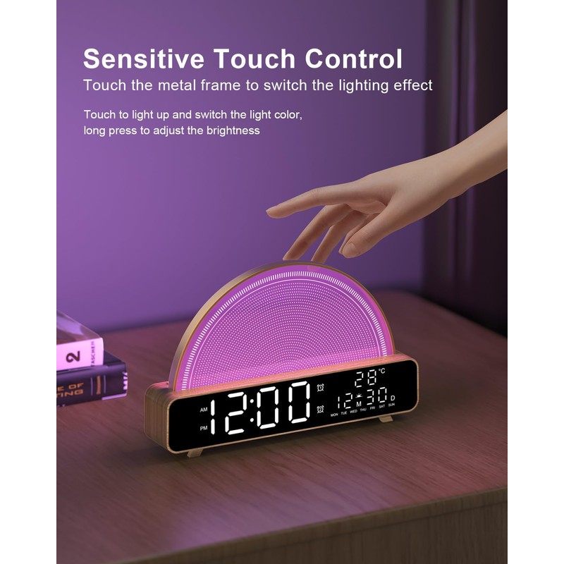 - Multi-function white noise sunrise alar clock touch bedside lamplt canbe a desk lamp, dual alarm clock, thermometer:(C/'F),large screen clock(12/24), calendar,USB interface can be used to charge USB devices.Its semi-arc design makes it look like a wooden furniture decoration,suitable for multiple scenes lsbirthday,Easter,Halloween,,etc.,the old and young ideal gifts,Passed FCC/ROHS certification.There is atwo-year validity period,if you have further questions about the product,please feel free to contact us