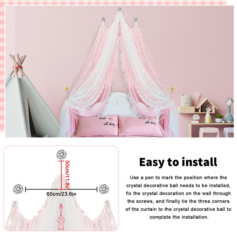 - 【Contents Included】This girls' bed canopy set comes with three crystal ornaments, a set of bed curtains, a string of lights, and two hooks