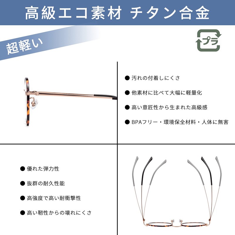 - 【チタン合金 β-TITANIUM】チタンは、高い耐食性から自然界に流出しない環境負荷の低い金属であるが、この性能は人体に対しても同様であり、生体適合性に優れた金属であるといえます。義手・義足・人工骨・インプラントなどの人体に接触面を持つ医療器具に適用されています。「軽さ・抜群の耐久性能・BPAフリーの高級エコ素材」がポイントです。本メガネにチタン部分はヒンジからモダンまでです。
