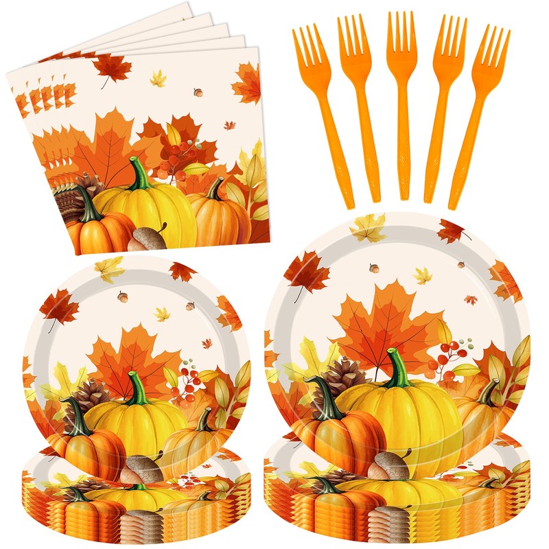 - 【Package Including】Our Thanksgiving Party Decoration Set comes with 24pcs 9" pumpkin dinner plates, 24pcs 7" maple leaves dessert plates, 24pcs napkins, 24pcs forks, a total of 96 pieces. Sufficient quantity for the gathering with your friends or families at the 2025 Fall Thanksgiving Party.