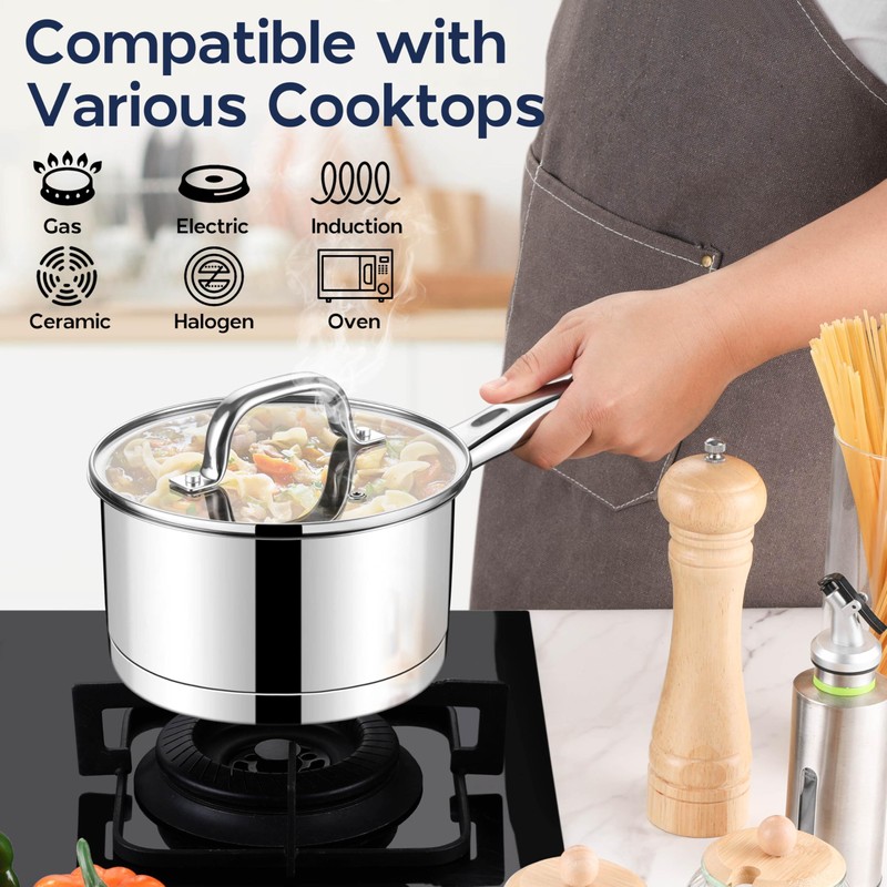 - Suitable for all Stovetops: the stainless steel saucepan is constructed of try-ply bottom, with an aluminum core for even heat distribution and quick heating, also compatible with all cooktops, including induction, gas, electric, and ceramic, meets your versatile cooking needs