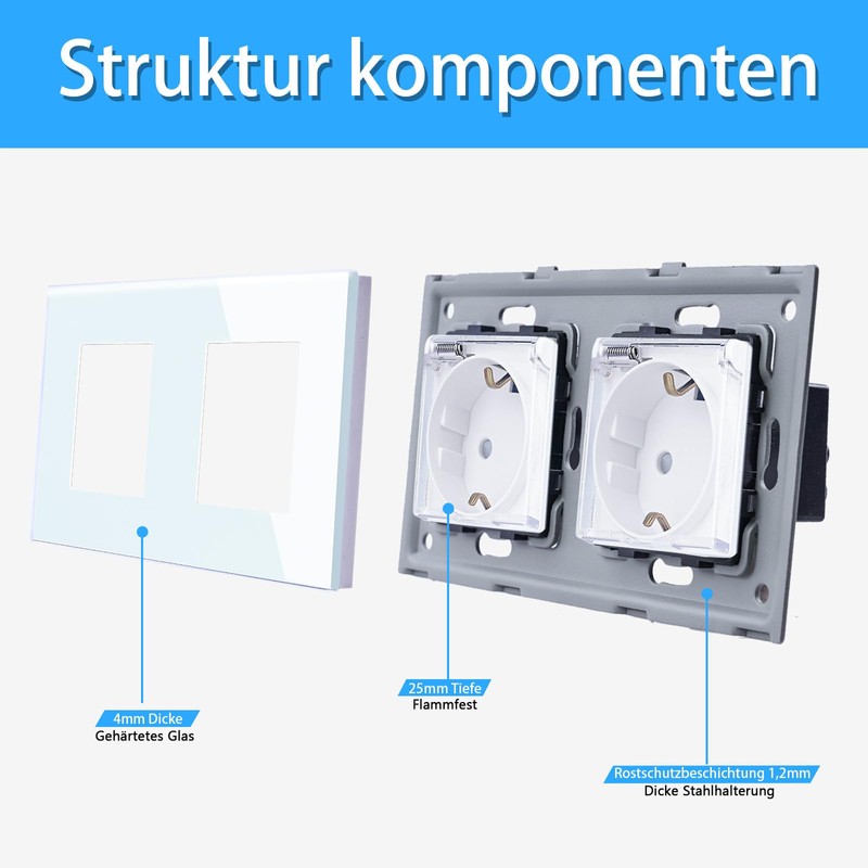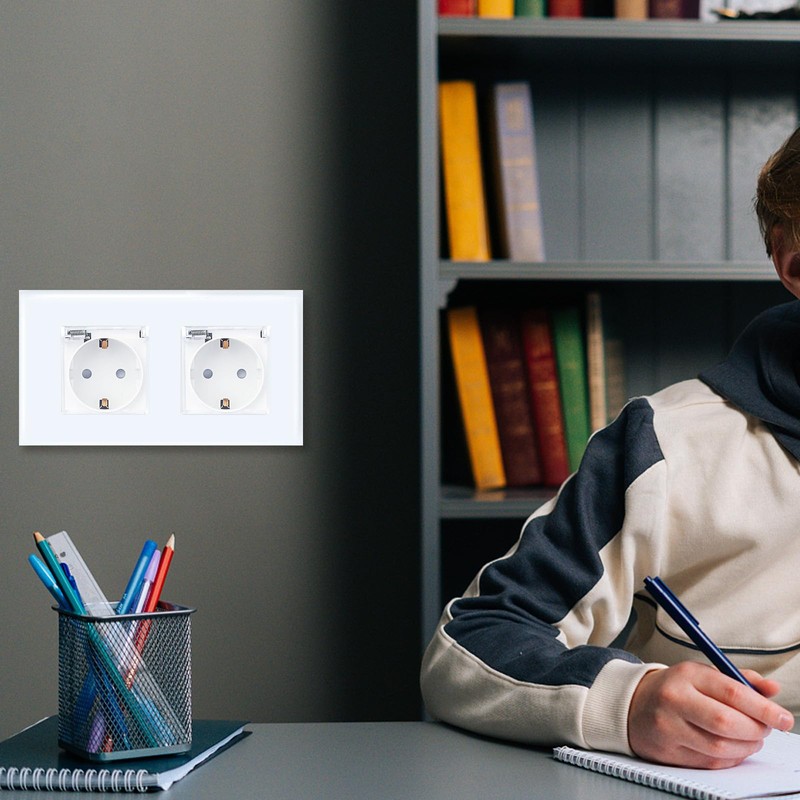 - Function: Neutral line is required. Glass Schuko recessed socket with earthing contacts and electronic short circuit protection. Prevent the occurrence of leaks and electric shock; the plate is reassembled