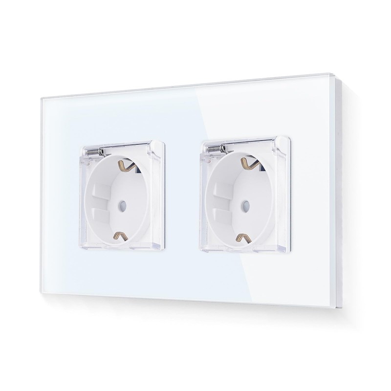 LIAONFOY Glass Schuko Double Socket with Lid Flush-Mounted 2-Way Wall Socket White Colour with Glass Frame 16 Amp 110-250 V 157 mm