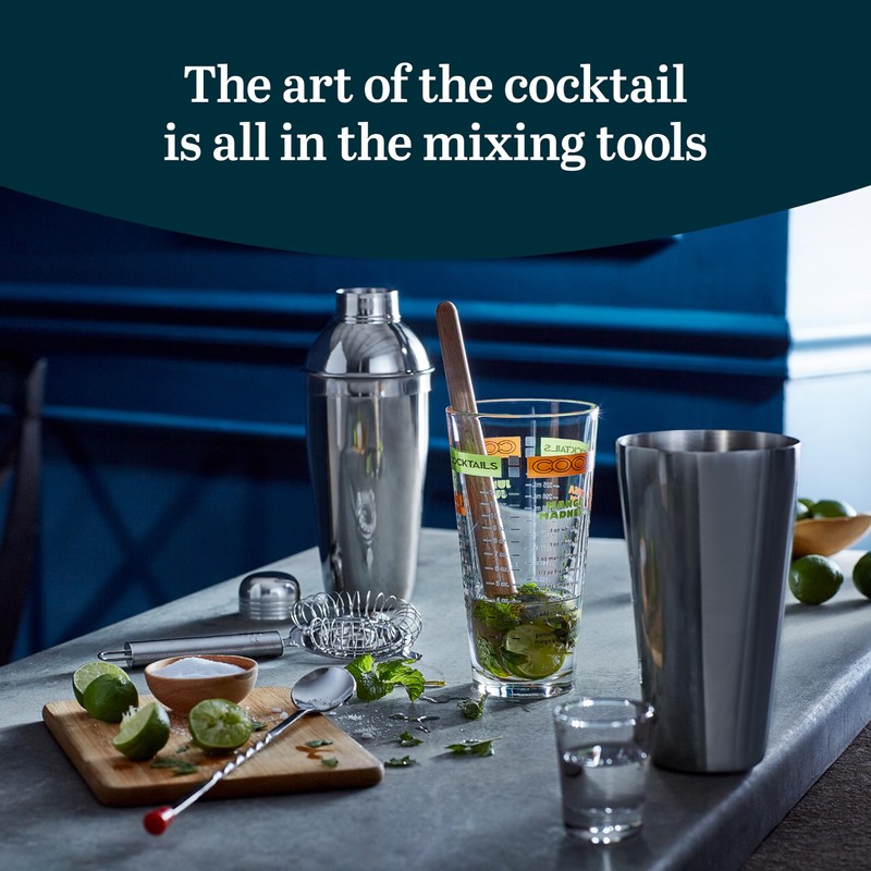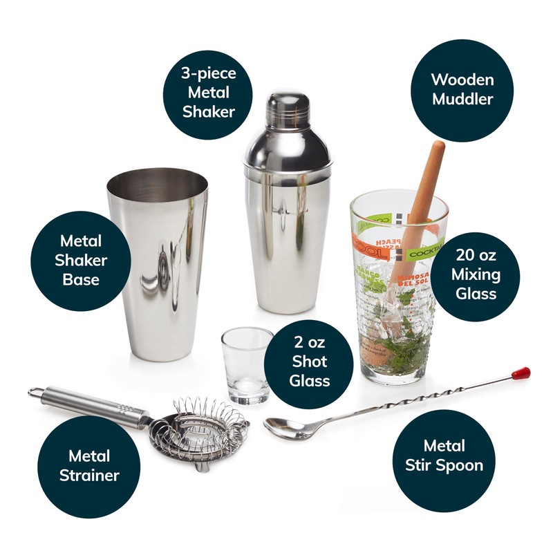 - Includes 1, 2-ounce shot glass; 1, 20-ounce mixing glass; 1 metal strainer; 1 wooden muddler; 1 metal stir spoon; 1 metal shaker base; and 1, 3-piece metal shaker