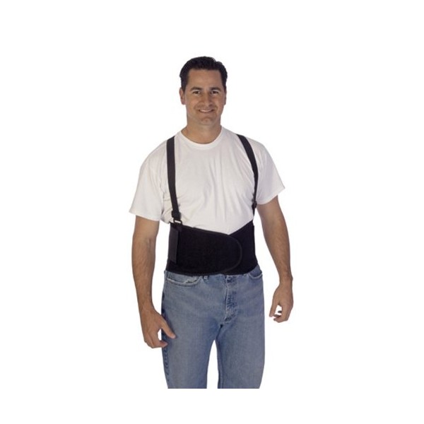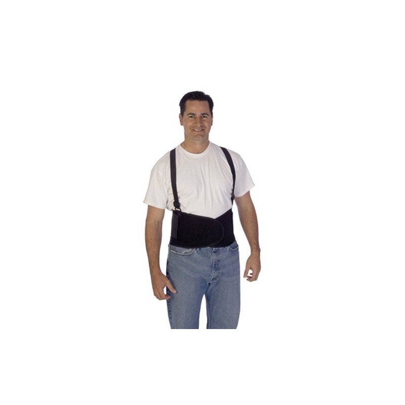 Liberty plain back support belt with detachable adjustable suspenders and smooth glide adjustable clips. Support elastic suspenders are extra wide for durability and abdominal support panels are tapered for better fit. Medium size. Black color.