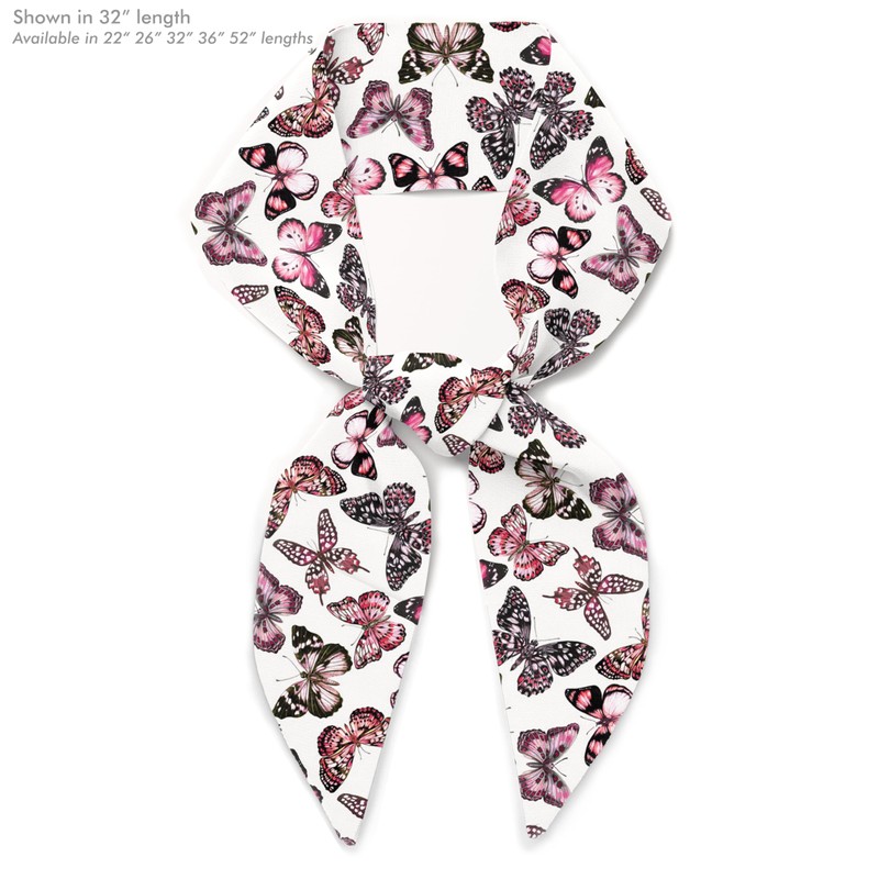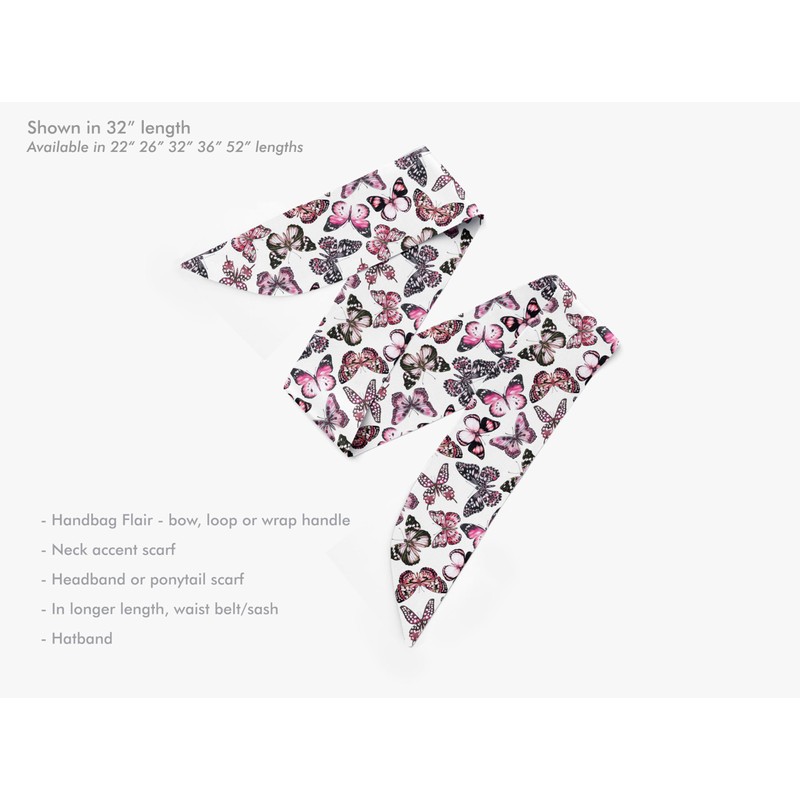 - Liberty London Julie Butterfly Pink Skinny Scarf/Twilly, 22", 26", 32", 36", 52" length, 2" wide, angled edges.