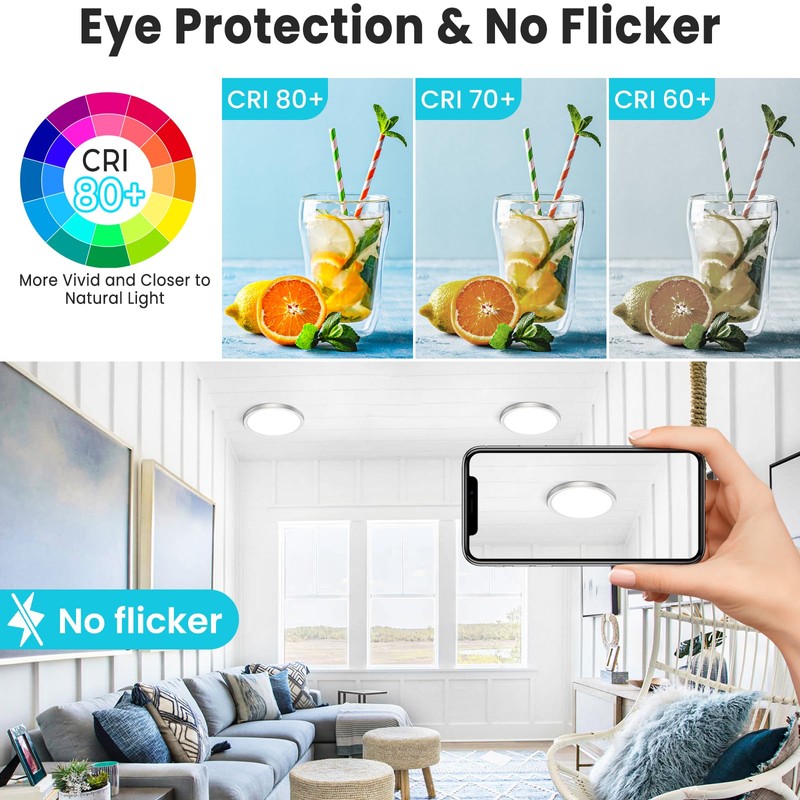 - 【Install is a Breeze】The ultra-thin silver-toned ceiling light fixture offers strong adaptability, allowing for flush-mounting and surface-mounting on any ceiling area. With its humanized base design, it matches 99% of junction boxes. No electrician is required for installation, thanks to the user-friendly installation method. Utilize the included accessories to easily and independently install the low profile ceiling light, saving you time and effort.