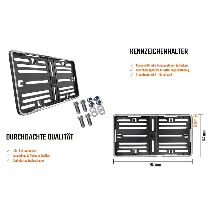 • Very durable // Material unbreakable ABS plastic // Integrated spring elements that prevent the rattling of the number plate