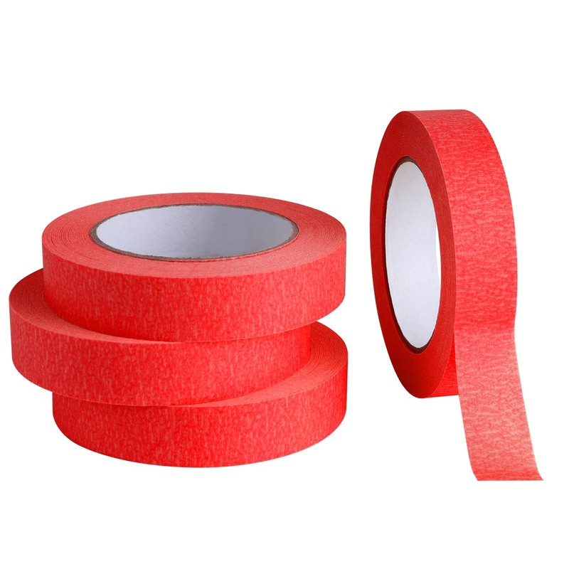 Lichamp Painters Tape Masking Tape, red, 1 inch, 55 yards per roll, 4 rolls include, total 220 yardsFeatures:1. Good instant adhesion that sticks to a wide variety of surfaces and helps reduce labor.2. Good holding power to help resist lifting or curling.3. Crepe paper backing provides conformability for easy handling and application.4. Easily hand tearable, yet resists slivering.5. Special backsize treatment provides easy to use controlled unwind.6. Designed for indoor and outdoor use.Typical Physical Properties:Adhesion to Steel: 25 oz./in. width (27 N/100 mm)Tensile Strength: 19 lbs./in. width (333 N/100 mm)Elongation at Break: 8%Tape Thickness: 4.4 mils (0.11 mm)Temperature Use Range: Up to 200°F (93°C) for 30 minutesStore under normal conditions of 70°F (21°C) and 50% R.H. in the original carton.How to use:1. Clean Surface: The surface should be clean, dry and dust-free so the tape sticks properly.2. Apply Tape: Lay tape onto the surface, pressing down as you go. Don't stretch the tape, or it may lift or break.3. Secure Tape: Press tape down firmly with a smooth edge, like a putty knife or credit card.4. Let Tape Set: Wait about 30 to 60 minutes before you begin painting.5. Wait: Wait until the paint is dry to the touch before removing the tape. Check the paint can for the manufacturer's dry times.6. Score: Use a putty knife or razor blade to score along the edge of the tape. This prevents paint from being pulled up with the tape and from cracking along the paint line.7. Tape: Taking your time, lift up the painter's tape and pull it back on itself, removing at a 45 degree angle. If adhesive sticks to the surface, try a 90-degree angle.8. Clean Finish: You'll get a sharp, clean line and a professional looking paint job!