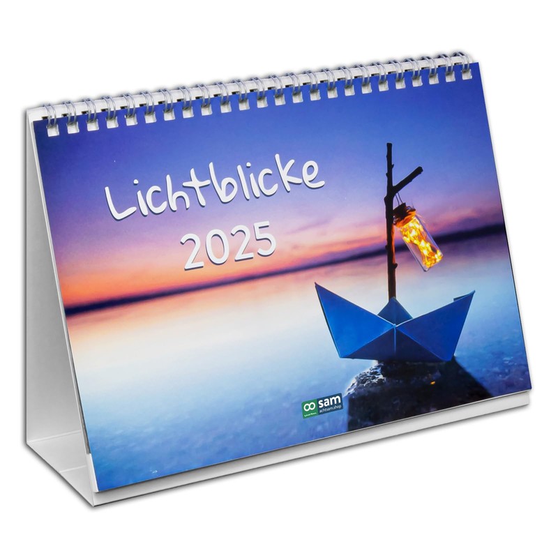 Lichtblicke 2025 - Your companion for conscious moments and small breaks in everyday life. The Lichtblicke 2025 desk calendar is much more than just a calendar - it is a quiet, loving companion through the year that gently reminds you that you have the choice to do something good for yourself at every moment. It invites you to give you not only a break, but consciously space for yourself. A moment to come to rest, gather new strength and perceive the quiet tones of your heart. With its 12 unique monthly motifs, it accompanies you through all the ups and downs of the year and gives you small islands of serenity and inspiration month after month - whether in hectic everyday work or in quiet moments at home. Each message is a gentle reminder to pause and connect with your inner strength to find strength within yourself. This calendar is more than just a decoration - it is an invitation to enjoy life more consciously and treat yourself with loving attention. His words whisper to you: "You can take this room, you can be important to yourself." For a year, it accompanies you with quiet encouragement and strengthens you, step by step, to walk your way with more serenity and inner confidence. A wonderful gift for yourself or for someone you care about – a whole year full of bright spots and quiet impulses that help life with more ease and confidence. Format: 210 x 148 mm / A5 landscape. Material: 170 g matt finish: Wire-O binding