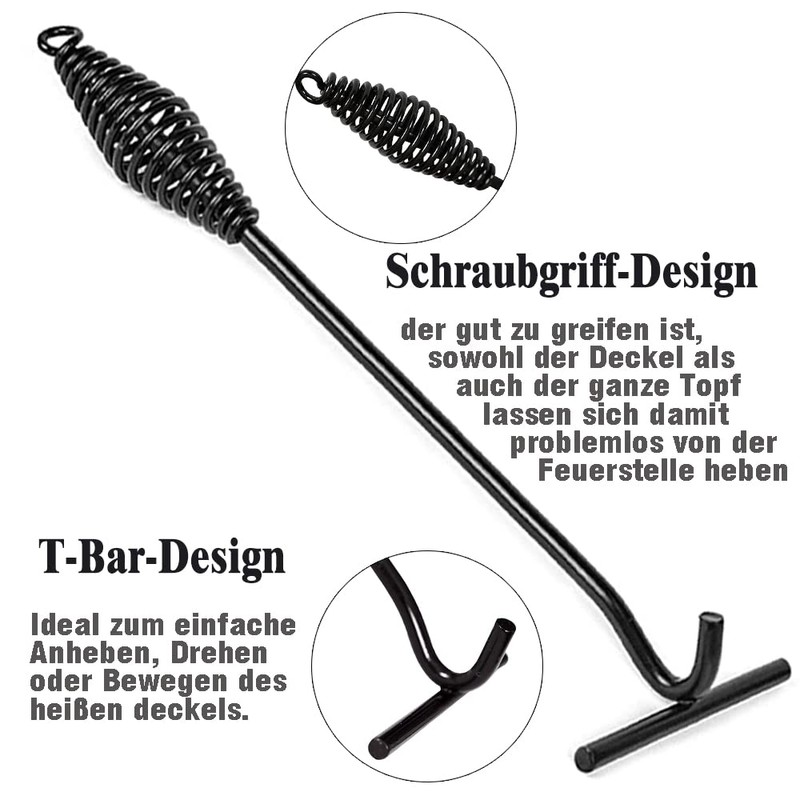 - The T-bar design is ideal for easily lifting, turning or moving the hot lid. Non-slip handle shape that is easy to grip. Both the lid and the whole pot can be easily lifted from the fireplace.