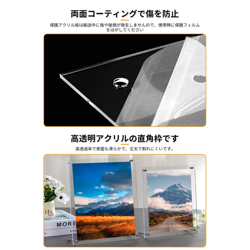 - (Product Specifications) Acrylic picture frame with thickness of 0.1 + 0.1 inch (3 mm + 3 mm); Storage photo size: 4.0 x 6.0 inches (102 x 152 mm); Applicable paper size: KG. (Product accessories: Acrylic photo frame + screws + hanging rope + gloves