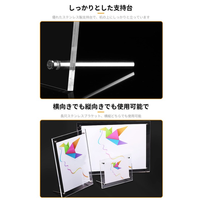 - How to put your desk: Attach the male or female screws on the 2 acrylic plates to complete the setup and place it vertically or horizontally, and change the position of the posts supporting the frame to change the position. If you attach the wire to the frame, you can hang it on the wall. Please peel off the protective film upon arrival