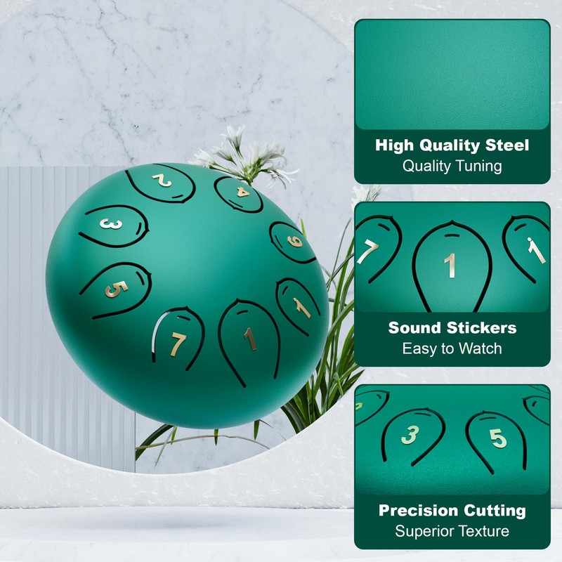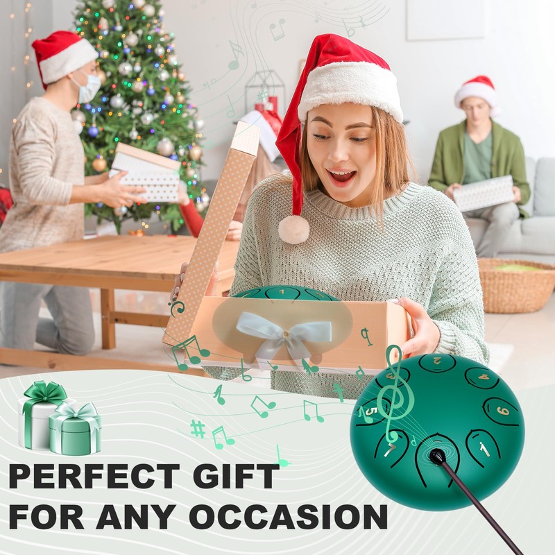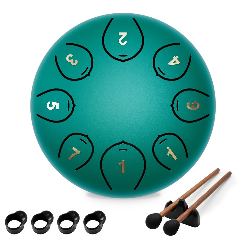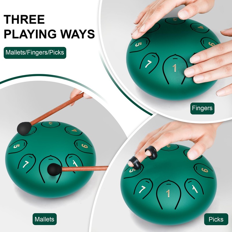 - What You Get: 1 steel tongue drum, 2 drum mallets, 1 mallet holder, 4 finger picks, 1 set of note stickers, 1 music book and 1 travel bag