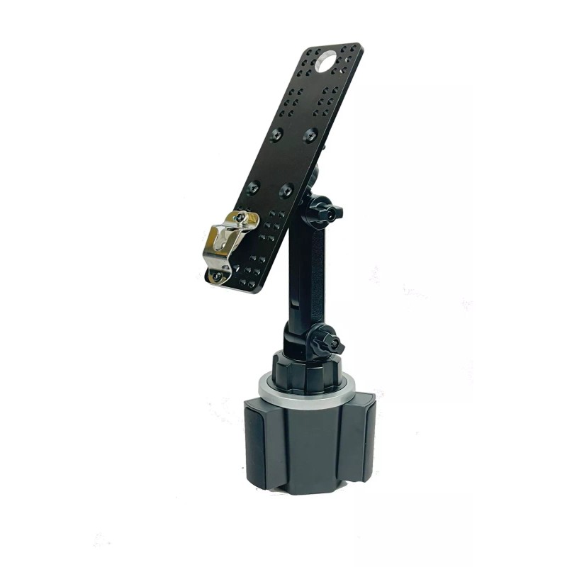 Our new LM-803 Cup holder mount height can be adjusted from 6 1/2" to 8" From the top of the adjustable base. The base can be expanded from 2 1/4" to 3 3/4" in diameter by turning the expansion knob.