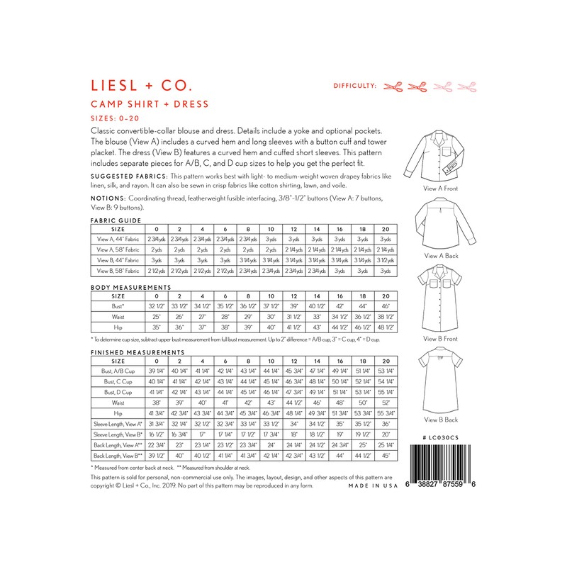 - The Camp Shirt + Dress pattern makes a classic convertible-collar blouse and dress. Details include a yoke and optional chest pockets. The blouse (View A) includes a curved hem and long sleeves with a button cuff and tower placket. The dress (View B) features a curved hem and cuffed short sleeves. This pattern includes separate pieces for A/B C and D cup sizes to get you the perfect fit. Difficulty: Advanced Beginner; Suitable for someone who has sewn from a pattern before...