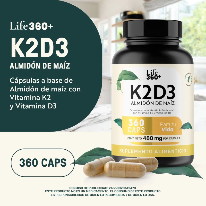 LIFE360+ K2D3 Almidón de maíz es un suplemento alimenticio que combina vitamina K2, vitamina D3 y almidón de maiz. Cada tarro contiene 360 cápsulas ¡Descubre los descuentos y ofertas exclusivas que LIFE 360+ tiene disponibles para ti en Mercado Libre!