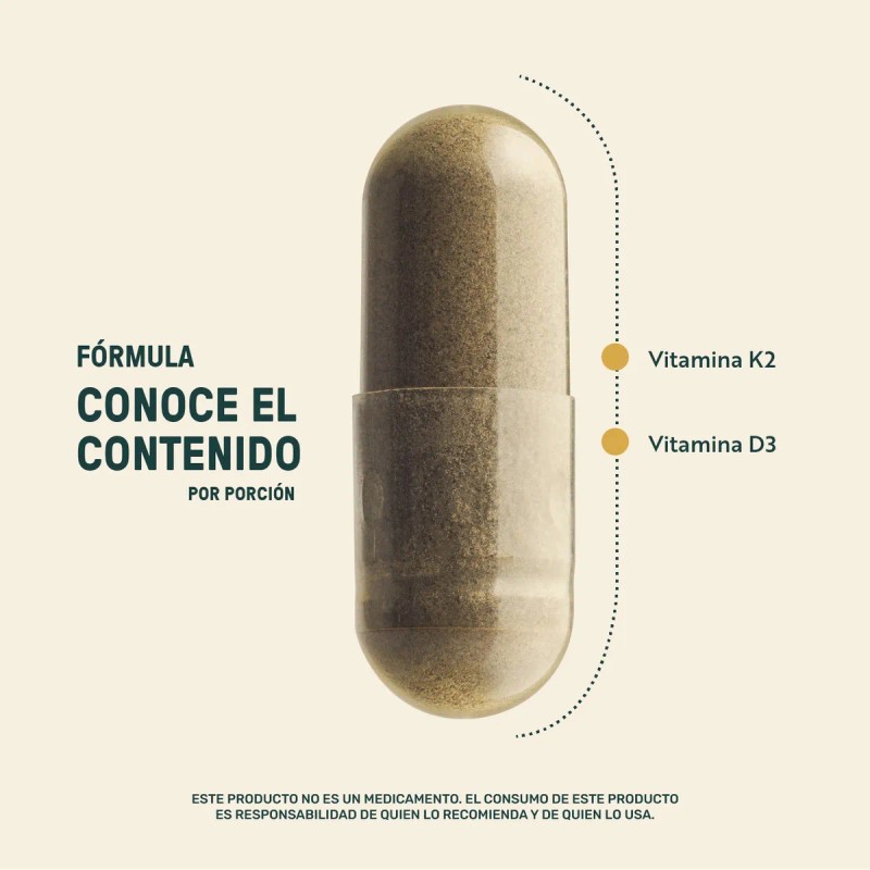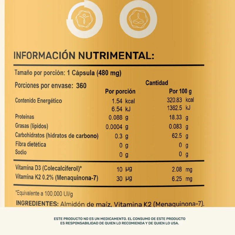 COMPOSICIÓN PRINCIPAL: LIFE360+ K2D3 almidón de maíz suplemento alimenticio en cápsulas contiene Almidón de maíz, Vitamina K2 (Menaquinona-7) y Vitamina D3 (Colecalciferol) como ingredientes principales dentro de la formulación del producto.