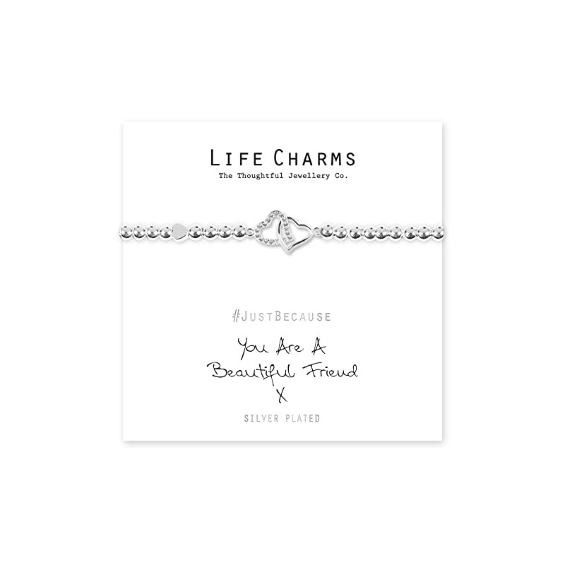 • Pure silver plated entwind heart Charms with diamantes, presented on a 5mm beaded stretch bracelet. The bracelet comes presented in a luxury gift box with a Just Because 'YouAre A Beautiful Friend' card. All jewellery is finished to the highest standard & E-coated to prevent any tarnishing.